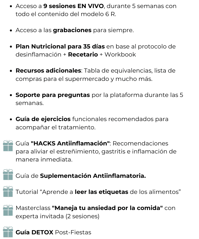 Acceso a 9 sesiones EN VIVO grupales por Zoom, en las que voy a guiarte por cada una de las etapas para restaurar tu microbiota y eliminar tus síntomas.
