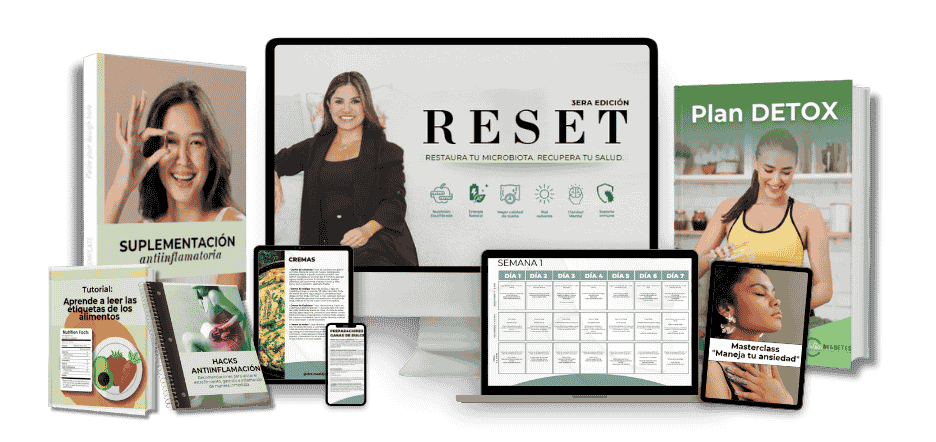 Utilizando la alimentación real y la suplementación antiinflamatoria, RESET te ayudará a sanar tu digestión, regenerar tu microbiota y revertir la disbiosis intestinal.